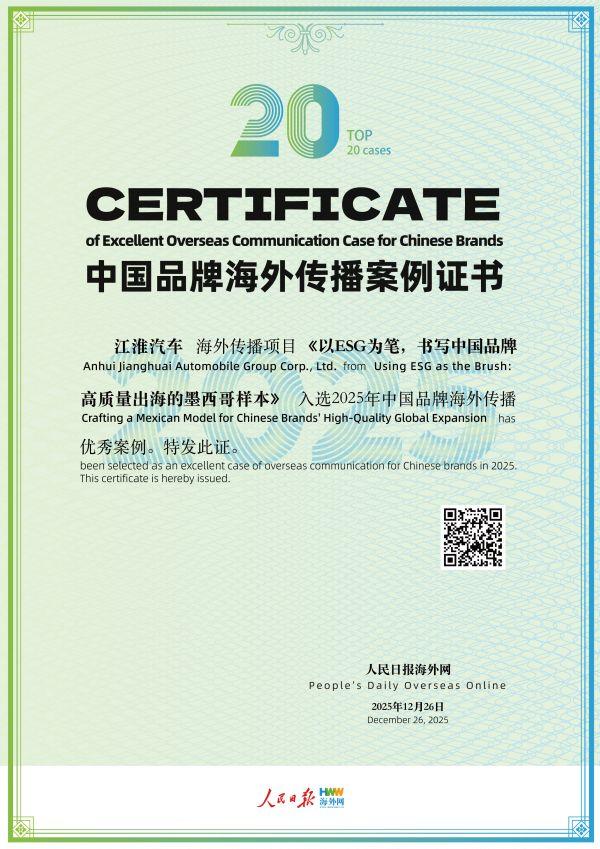 2025年12月26日,由人民日报海外网、中华环保联合会与中国质量认证中心联合主办的“第三届中国品牌形象海外传播论坛暨2025中国企业ESG蓝皮书发布会”在人民日报社隆重举行。江淮汽车凭借其在海外市场的卓越表现以及在ESG领域的创新实践一举斩获双重荣誉:成功入选“2025中国出海品牌100强指数”,其海外传播项目《以ESG为笔,书写中国品牌高质量出海的墨西哥样本》获评“2025中国品牌海外传播优秀案例”,彰显了中国汽车品牌在全球化进程中的综合实力与可持续发展责任担当。