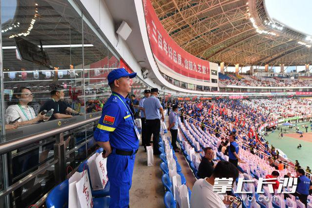 长沙晚报掌上长沙9月7日讯(全媒体记者舒元臻)7日晚,长沙夏夜的热浪被欢呼搅动成潮,贺龙体育场人声鼎沸。在红色“海洋”中,有蓝色身影闪耀,他们面对狂欢热潮,环顾四周看台,对讲机里时不时传来指令……
