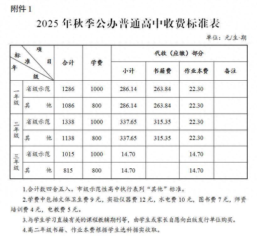 公办普通高中学费分为省级示范性高中和其他高中两个档次,具体标准见《2025年秋季公办普通高中收费标准表》。公办普通高中对家庭经济困难等政策范围内学生免收学杂费和教材费。中外合作办学收费则需由市发改委会同市财政局、市教育局按相关规定审批。
