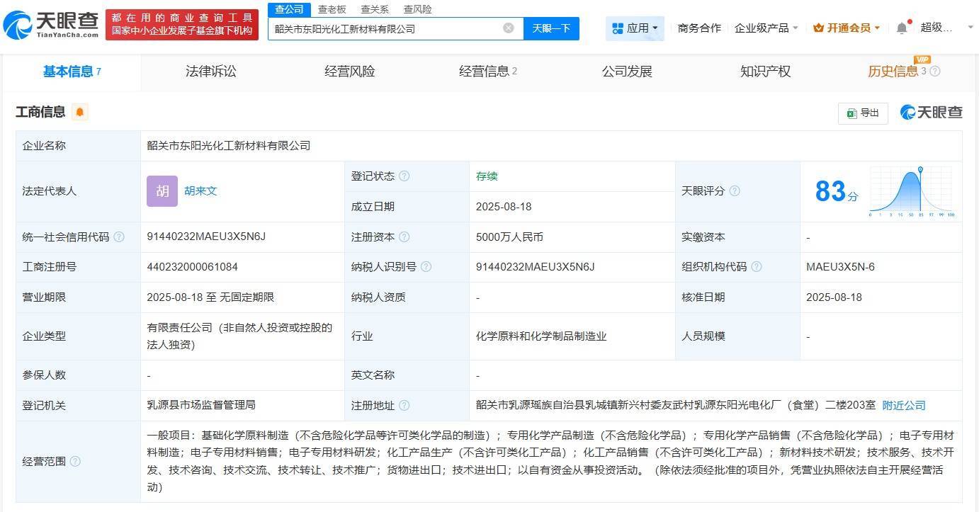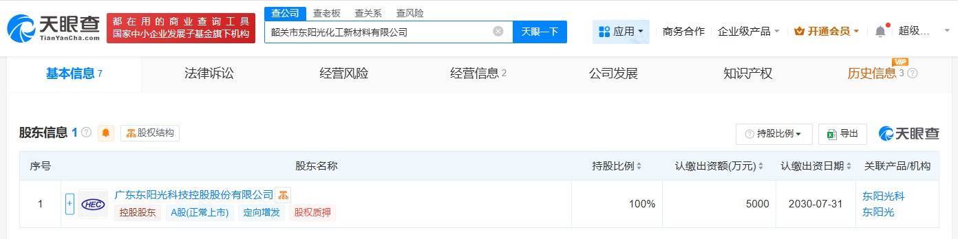 天眼查工商信息显示在线配资论坛,近日,韶关市东阳光化工新材料有限公司成立,法定代表人为胡来文,注册资本5000万人民币,经营范围包括电子专用材料制造、电子专用材料销售、电子专用材料研发、以自有资金从事投资活动等。股东信息显示,该公司由东阳光(600673)全资持股。